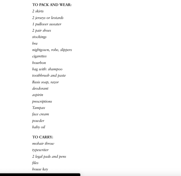 Packing list from The White Album , 1979 If someone has not read anything by Joan Didion, it can be daunting to begin. In March 2017, I purchased a copy of Democracy, and today cannot remember much besides the electric blue water I pictured as she described Hawaii. However, her writings about when she lived there are far more compelling. As a woman who said that she did not keep a diary (in an interview with Andy Warhol), there is a diaristic bareness to her writings on Hawaii, and the brilliant sarcasm of a place that is referred to as “paradise.”
