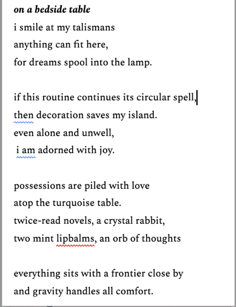 Her writing illumines the autotelic qualities within me, and the serial story of The Melting furthers my capacity for a flow state to spark. One sentence from one of the early Melting stories set off an entire poem, a reveling in domesticity and one’s own space.